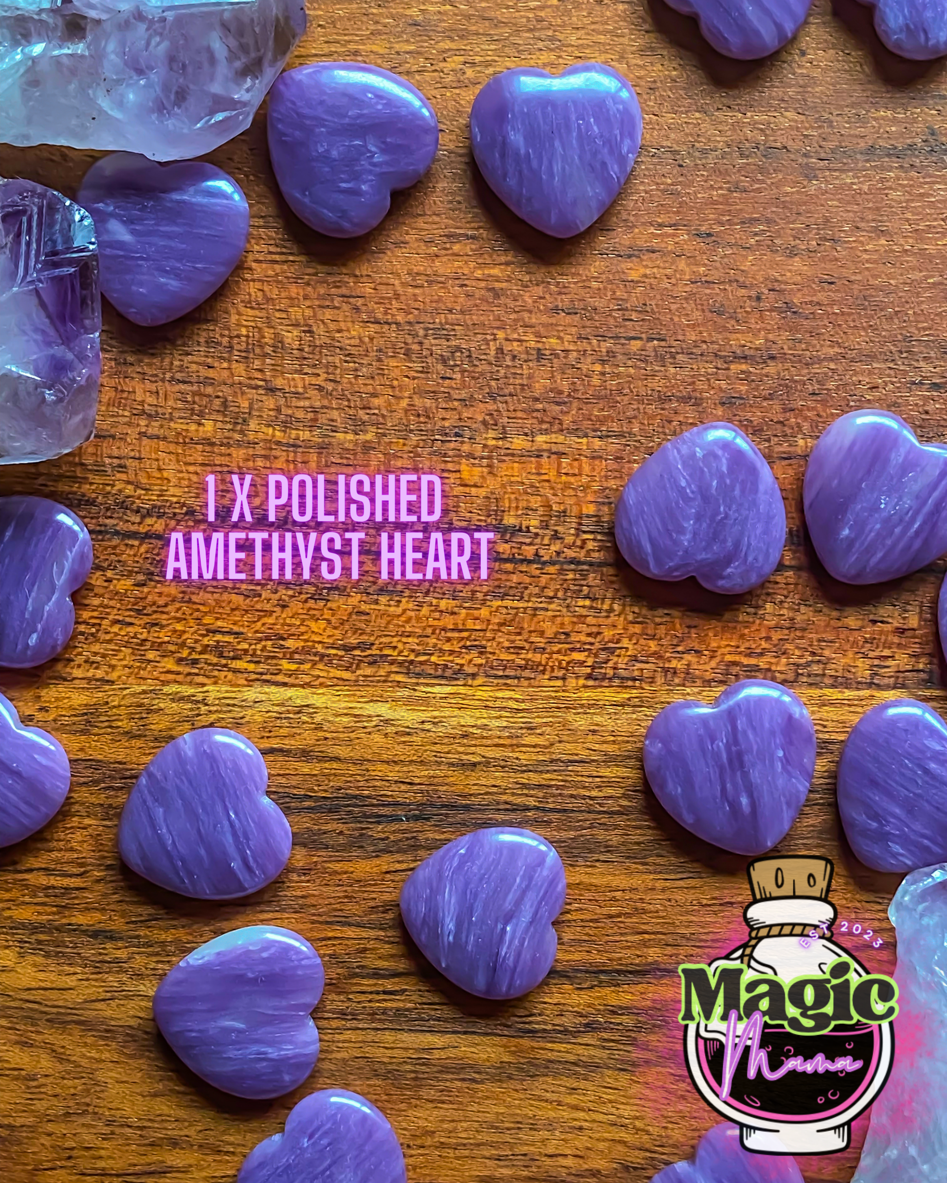 - 1 Polished Amethyst Heart: Amethyst is a stone of tranquility and calm, aiding in stress relief and enhancing spiritual awareness.